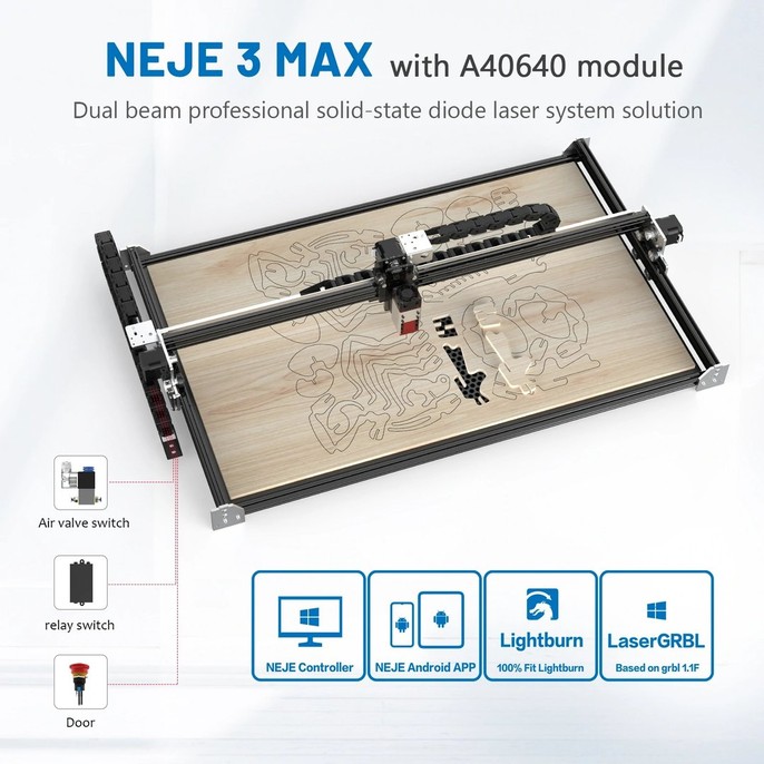 NEJE 3 Max est livré en standard avec un kit de vanne d'air M8 pour contrôler l'assistance d'air, un kit de commutateur de relais M7 pour contrôler le système d'évacuation des fumées et un interrupteur de porte pour l'arrêt d'urgence.